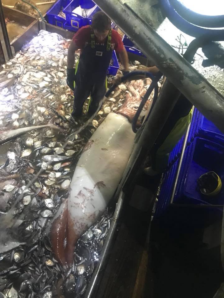 Alec Harvey, skipper of the Empress Pearl could not believe his eyes when his vessel recently caught this enormous squid. It is the biggest he has ever seen. It was caught in 380m of water off the west coast of Tasmania. It was estimated at 2.5-3 metres long and weighing 80-100kgs.