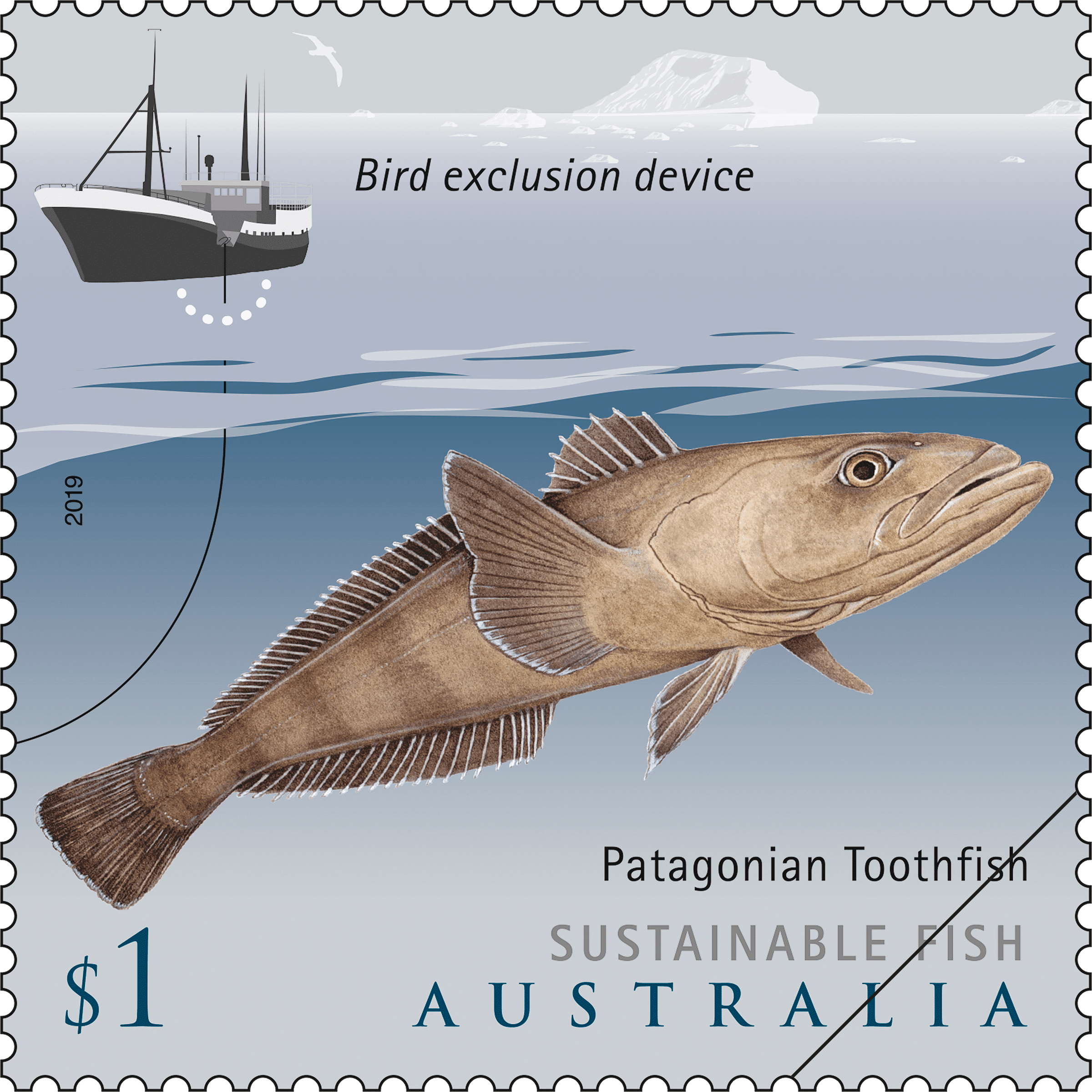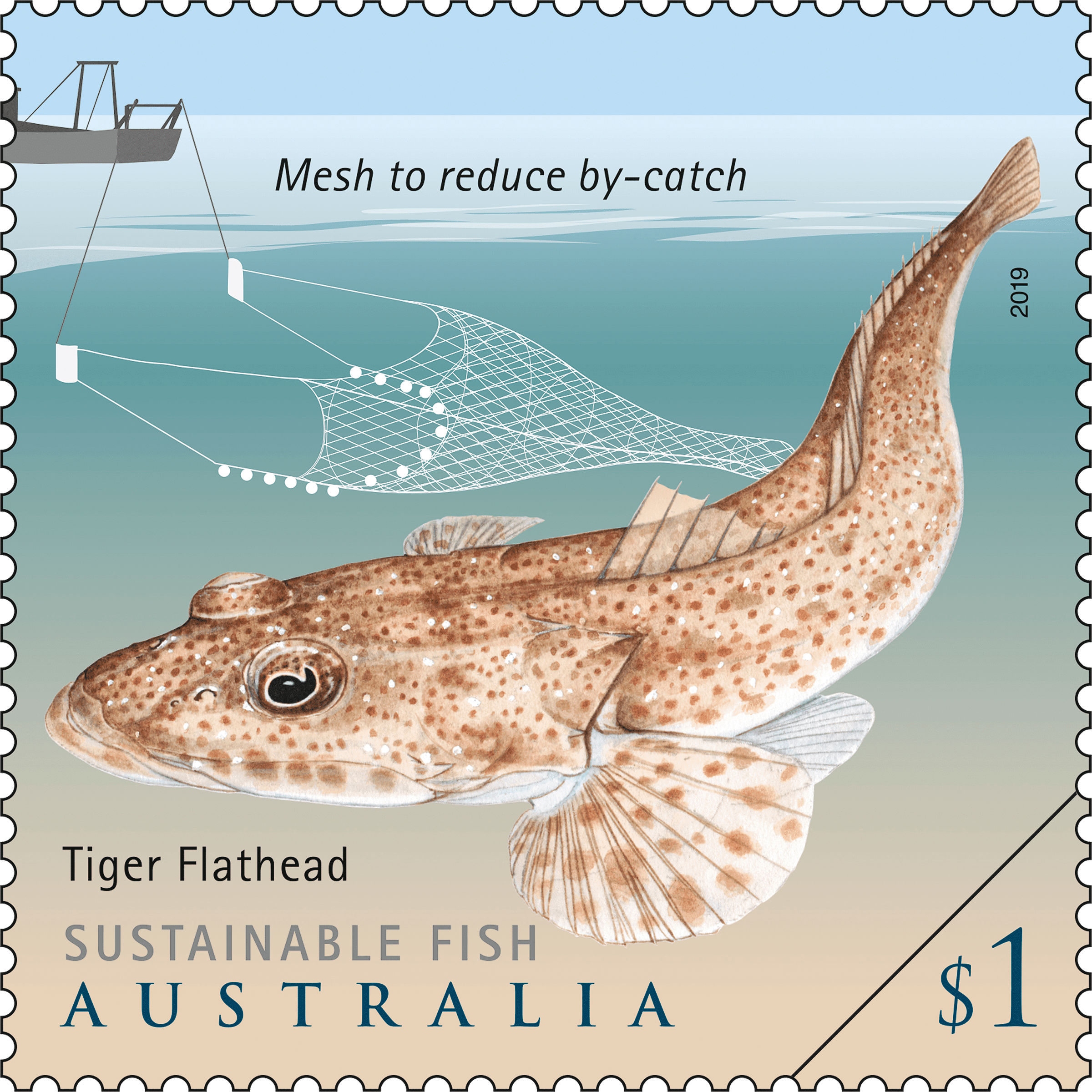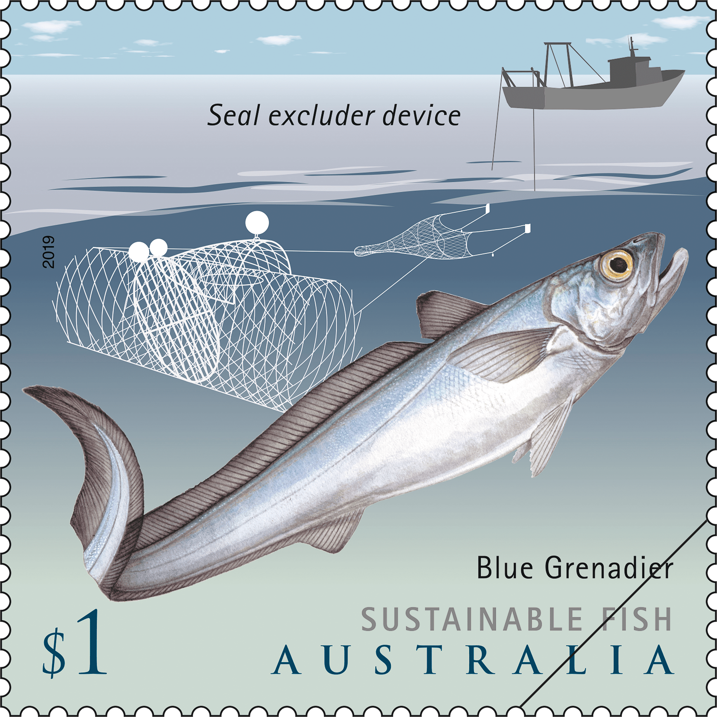 Stamp illustration is by Dr Lindsay Marshall, a natural history artist and a shark scientist. As well as an illustration of each fish species, in the background is a simplified graphic of a technique deployed in commercial fisheries to minimise environmental impacts.
