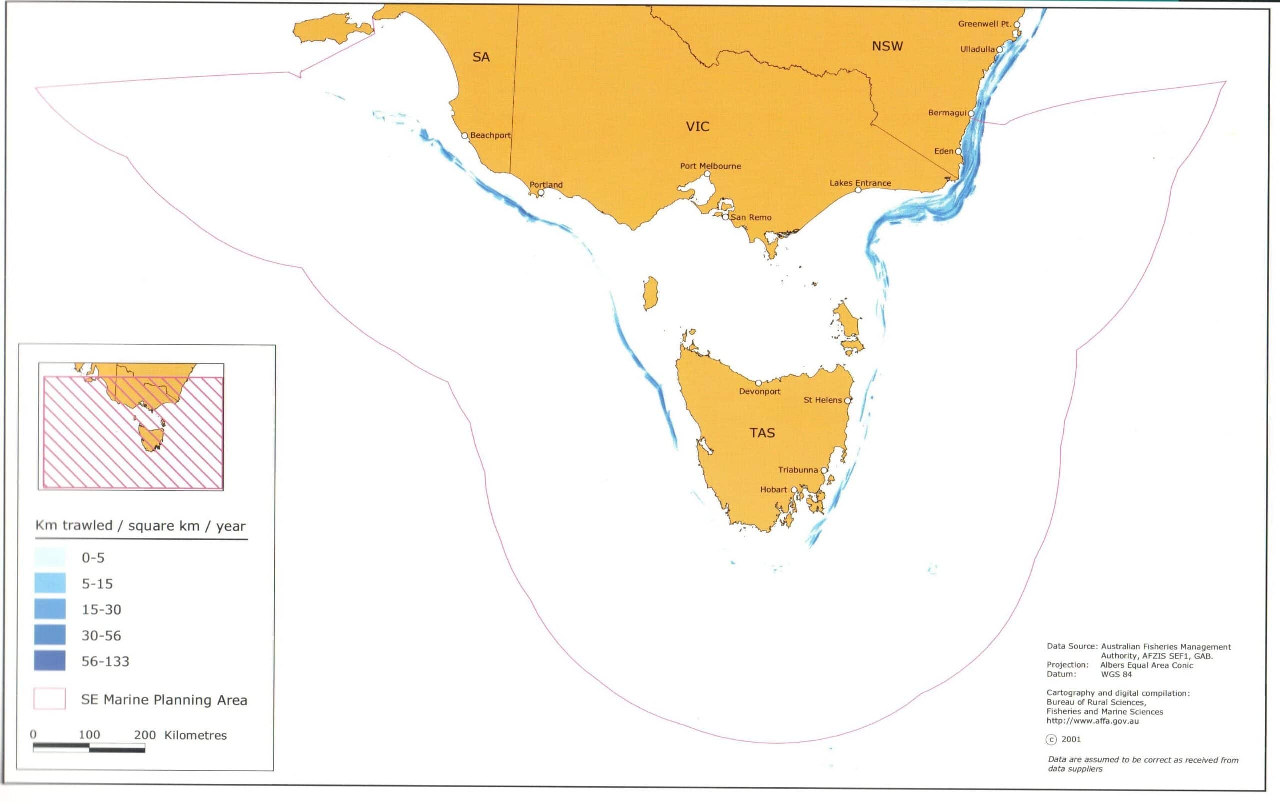 Fishing effort (km trawled/square km/year) by South East Trawl otter trawl vessels at the height of the trawl industry between 1995 –and 1999 (Larcombe et al, 2002). This footprint predates marine parks, most fishery closures and licence buy-backs so is currently much smaller and declining.