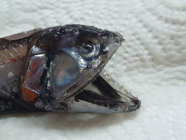 This species (tentatively identified as Phosichthys argenteus) has a large red light in front of its gills (see pics below) that is used to attract prey – primarily krill – to the vicinity of their ample mouth and needle sharp teeth.