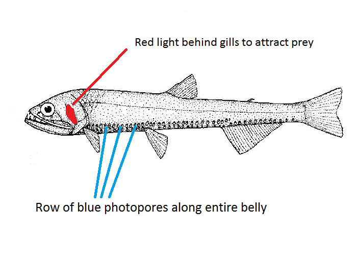 Lightfish (of the family Phosicthyidae) are small, common, mid-water fishes of the deep sea. They are highly bioluminescent, meaning they glow-in-the-dark and have a row of lights (called photopores by scientists) along their belly. These lights have a faint blue glow that acts to cancel out their silhouette when viewed from below against the faint blue light of the sun filtering down through the water. This counter-illumination acts as a form of stealth camouflage and makes it harder for predators to see them.