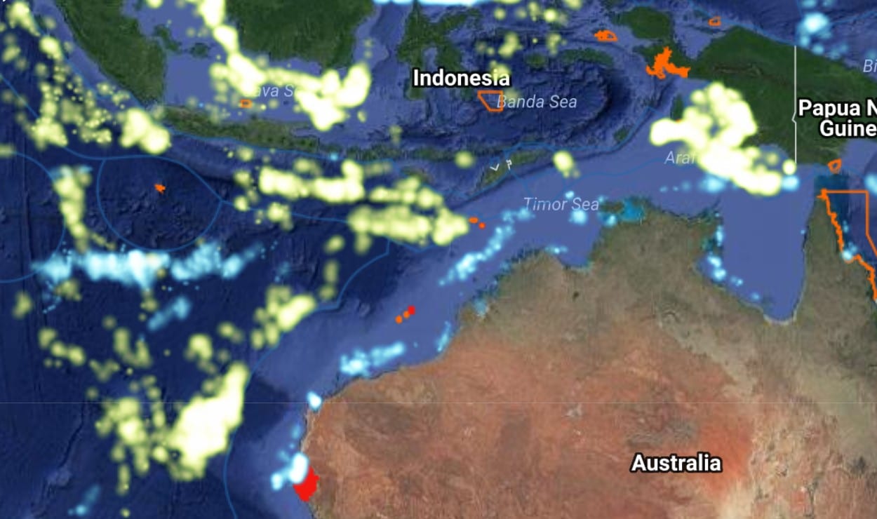A chart of North-West Australia shows the striking contrast in the scale of international and Australian fisheries with many more fishing vessels sitting outside the line (Australia’s EEZ) shown in yellow.