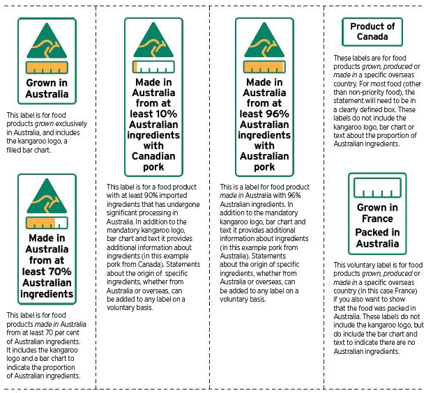 Australia is getting new food labelling so consumers can understand where their food comes from. Under the new labelling system, food grown, produced or made in Australia will carry a mandatory kangaroo and a bar chart indicating how much of the product contains Australian ingredients, plus a written percentage, based on the weight of the ingredients used. An accompanying explanatory statement will explain whether the food was grown, produced and/or made in Australia.