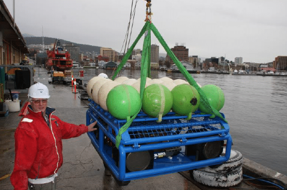 This latest survey featured a new net attached AOS (see CSIRO’s Mark Green below with the AOS on Hobart wharf) that was built to improve reliability and safety as well as new broadband technologies. The AOS was launched off a boat trailer at Burns Bay in St Helens where a tender transported it to the survey vessel.